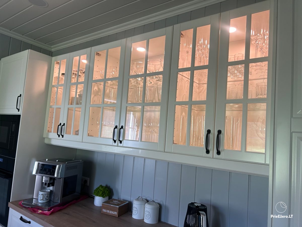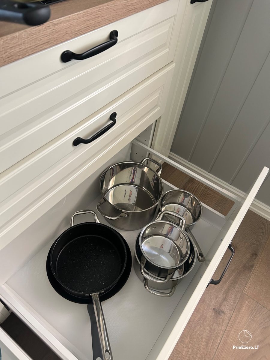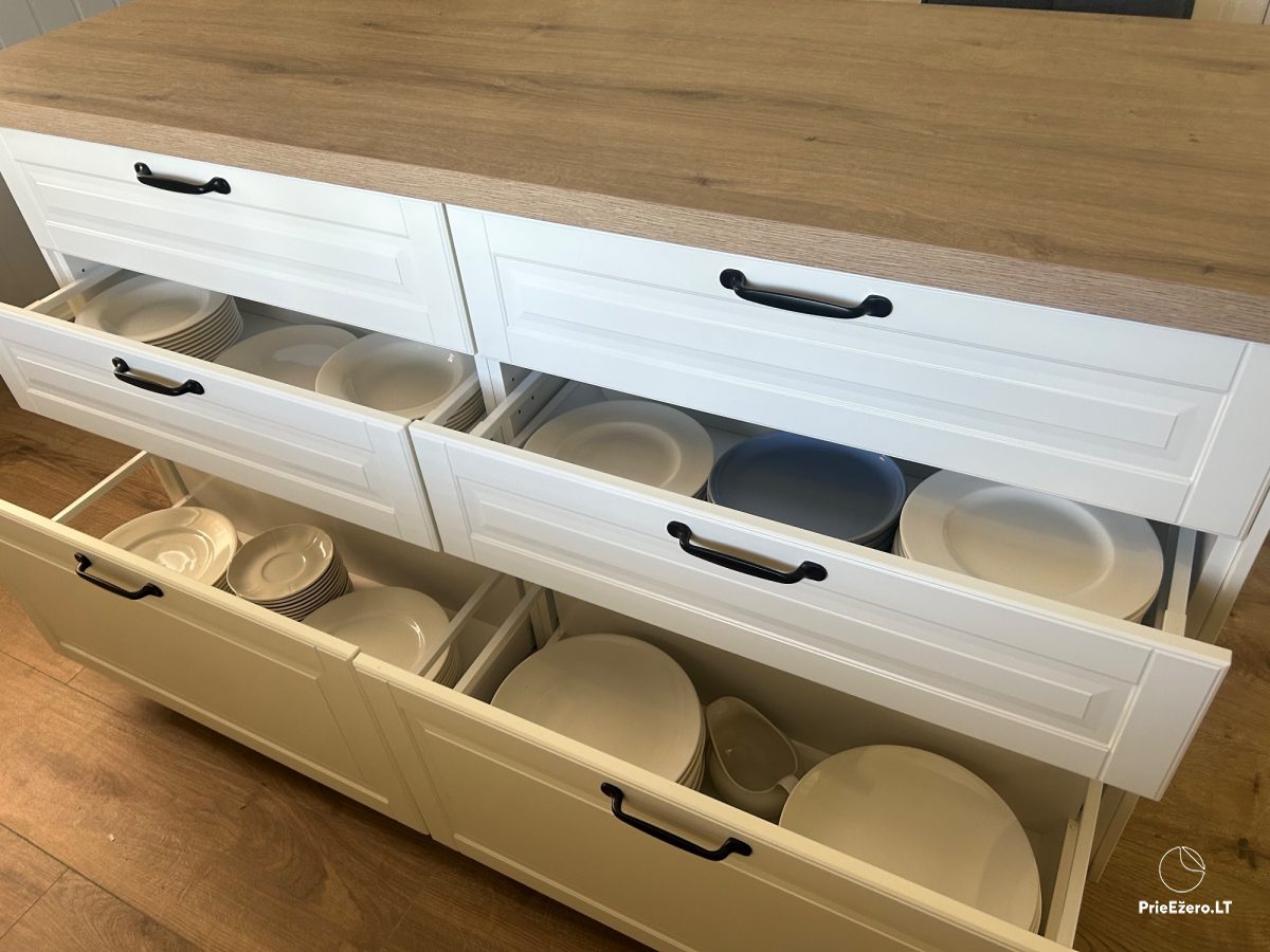 – Pilnai įrengta virtuvė su visa buitine įranga ir indais;