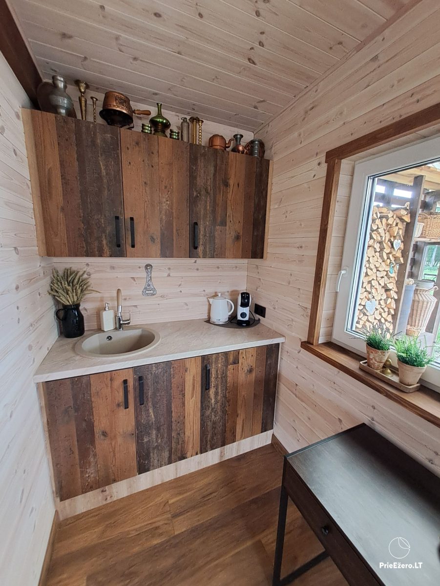 - Virtuvės reikmenys - indai, mikrobangų krosnelė, virdulys, kavos aparatas, šaldytuvas, iešmai, šašlykinė;