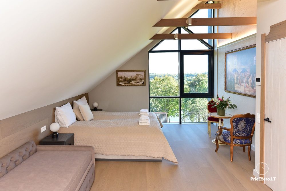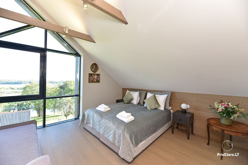 Vilos langus puošia vaizdai į žaliuojančią gamtą, ramų vandenį ir kraštovaizdį. Konrado Villa sukurta taip, kad kiekviena detalė kurtų šilumą, privatumo ir jaukumo jausmą – tiek mažoms šeimos šventėms, tiek dideliems renginiams.