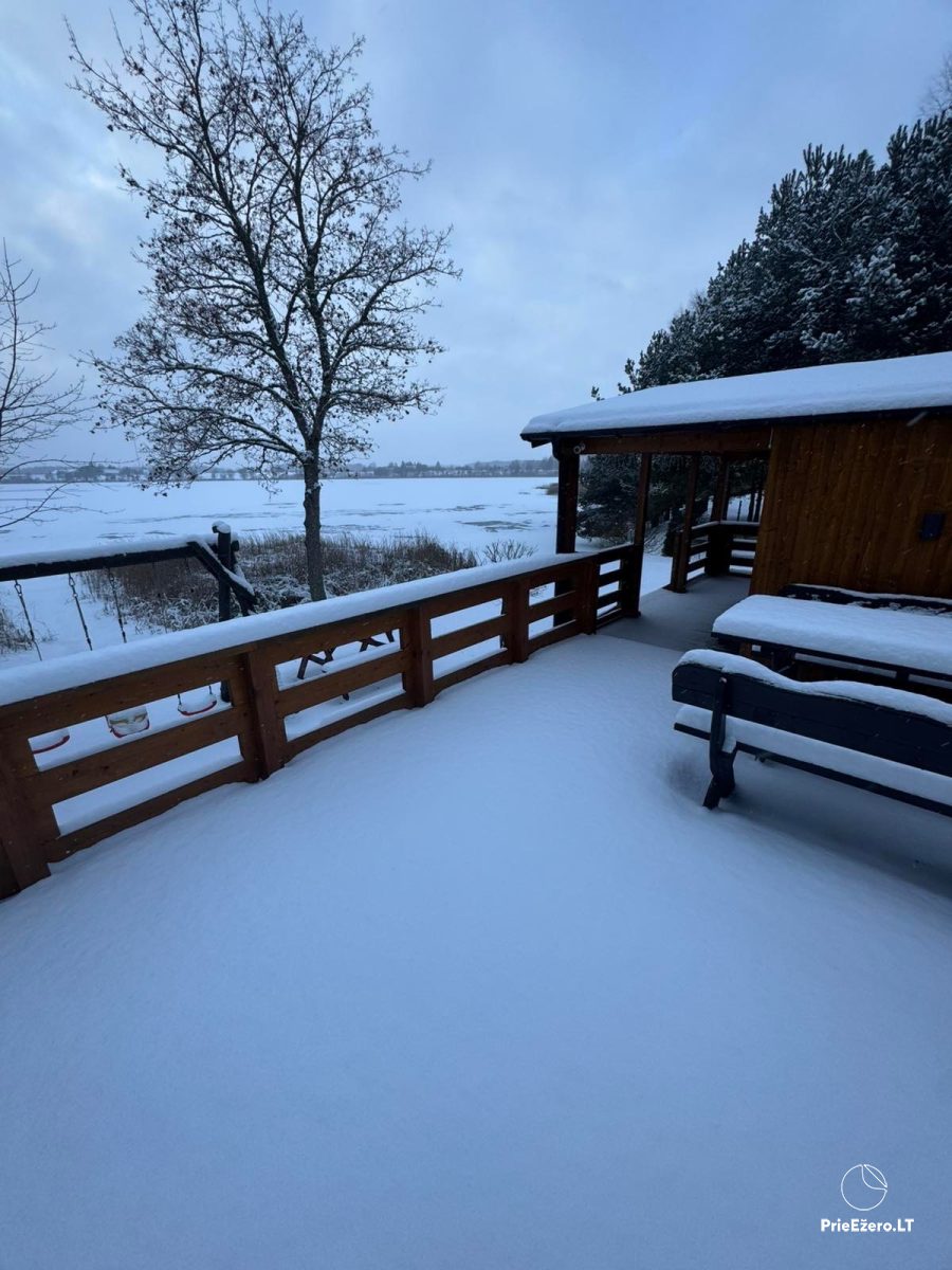 - Pirtis - didelis priepirtis su stalu ir suolais, dušas. Dideli vitrininiai, stumdomi langai į ežerą.