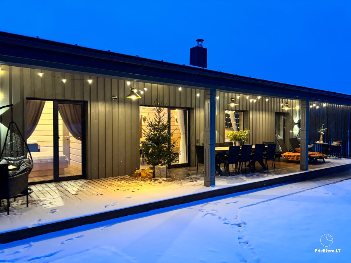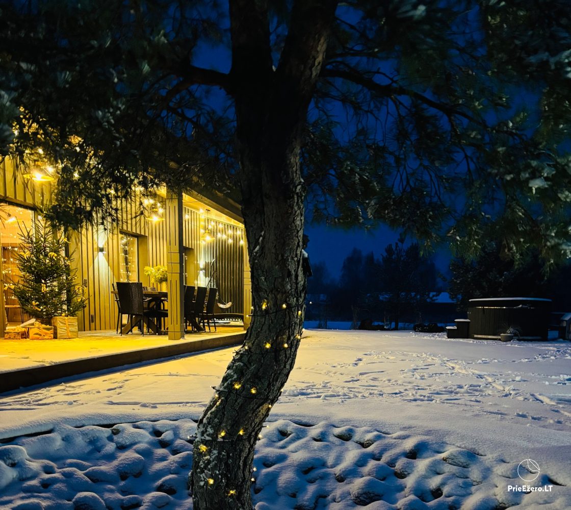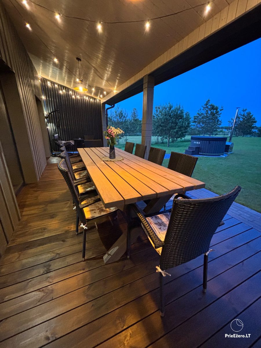 – Didelė terasa su dideliu 10- ies vietų stalu, gultai, lauko baldais ir kubilu vakarams po žvaigždėmis.
